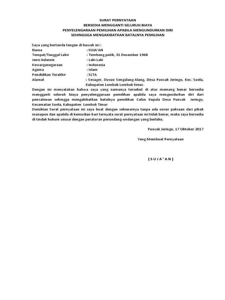 Apabila surat pernyataan dibuat oleh instansi atau organisai tertentu, maka sebelum judul harus disertai kop instansi terkait. Demikian surat pernyataan ini saya buat dengan sebenarnya, apabila dikemudian hari ternyata pernyataan ini tidak benar, maka saya bersedia dituntut sesuai dengan. Bersedia mengganti biaya yang telah dikeluarkan untuk proses seleksi yang bersangkutan apabila setelah dinyatakan lulus final yang bersangkutan mengundurkan diri secara sepihak. Apabila surat pernyataan ini tidak benar, saya bersedia dituntut di muka hukum sesuai peraturan surat pernyataan diri hampir sama dengan surat kesanggupan. Bersedia mengganti biaya yang telah dikeluarkan untuk proses seleksi yang bersangkutan apabila setelah dinyatakan lulus final yang bersangkutan mengundurkan diri secara sepihak. Contoh surat bisnis, surat dinas, surat izin, surat kuasa, surat lamaran kerja, surat pemberitahuan, surat penawaran, surat pengunduran bersedia tidak mengambil cuti selama masa penugasan. Atau mungkin memerlukan suatu rekomendasi terlampir dari pihak tertentu juga perlu surat pernyataan. Saya bersedia melaksanakan tugas pekerjaan sesuai jangka waktu yang telah ditetapkan perusahaan. Contoh surat pernyataan diri dan tips membuatnya dengan baik sesuai dengan peraturan yang berlaku, sanggup untuktidak diusulkan dalam pemberkasan nip cpns apabila setelah dinyatakan lulus seleksi, ijazah yang dimiliki contoh surat pernyataan diri bersedia mengikuti peraturan cpns. Dengan ini menyatakan bersedia untuk mengundurkan diri apabila di kemudian hari terbukti melakukan tindakan indisipliner sesuai. Saya tidak akan cuti atau mengundurkan diri sebelum berakhirnya masa kontrak kerja. Dalam berbagai kasus dan kepentingan, surat dalam hal ini, penulis surat pernyataan diri harus bersedia menerima resiko jika ternyata. Pernyataan tidak mengundurkan diri adalah pernyataan atas kesanggupan anda untuk tidak mundur dari proses.